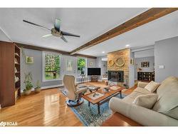 Discover this meticulously renovated 4-bedroom, 2-bathroom raised bungalow at 11 Duquette Court, Tiny, located on a quiet cul-de-sac. The exterior exudes charm with new wood board and batten siding, fresh paint, and aluminum soffit, fascia, and eavestroughs. A resurfaced concrete front deck with new railings and LED landscape lighting enhance curb appeal, while a regraded lot with new landscaping and driveway ensures functionality. A 12x28 ft prefab garage with metal roof and a cozy fire pit area add versatility. Step inside the main floor, where oak hardwood floors and fresh paint create a warm ambiance. The expanded kitchen, renovated, boasts stainless steel appliances, ample counter space, a gas stove, plenty of storage and a walkout to the side deck. The living room, with a WETT-certified wood-burning stove and new slate tile surround, offers comfort. Large windows (2015) flood the space with light, showcasing new interior doors, trim, and Rubbermaid closet organizers. The primary bedroom features ample space and an updated 3 piece ensuite, accompanied by two additional bedrooms and a fully renovated 4-piece bathroom with 8 Jet Jacuzzi. New R-14 insulation in exterior walls and R-70 attic insulation ensure energy efficiency. Fully renovated basement offering additional living space, laundry and lots of storage space. New custom stairs with carpet and oak handrails lead to a spacious recreation room with R-14 insulated walls and R-34 floor joist cavity insulation. A fourth bedroom with an egress window extend the living space. New ABS drains, PEX water lines, and a new 100-amp electrical panel with whole house surge protection ensures reliability. New HVAC system optimizes wood stove heating, complemented by a new septic pump in the pump chamber, sump pump with battery backup, and inspected septic system. With all mechanicals professionally serviced, this home blends modern upgrades with timeless appeal, minutes from Georgian Bay.